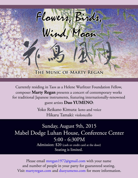 The program features the Flowers, Birds, Wind, Moon Suite for koto and violoncello, a series of four works based on core images of nature that recur throughout Japanese literature and the arts. Commissioned by Duo YUMENO, this performance marks the New Mexico premiere of Marty Regan’s extended work.Flowers Birds Marty Regan 8-9-15_blog
